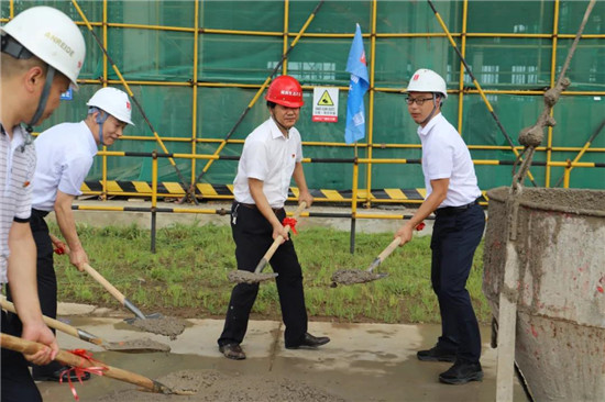 隨后,孵化中心舉行封頂儀式,各單位領(lǐng)導(dǎo)共同執(zhí)起金鍬,一起為項(xiàng)目完成最后一鏟土。隨著塔吊將最后一斗混凝土吊起,孵化中心正式封頂!