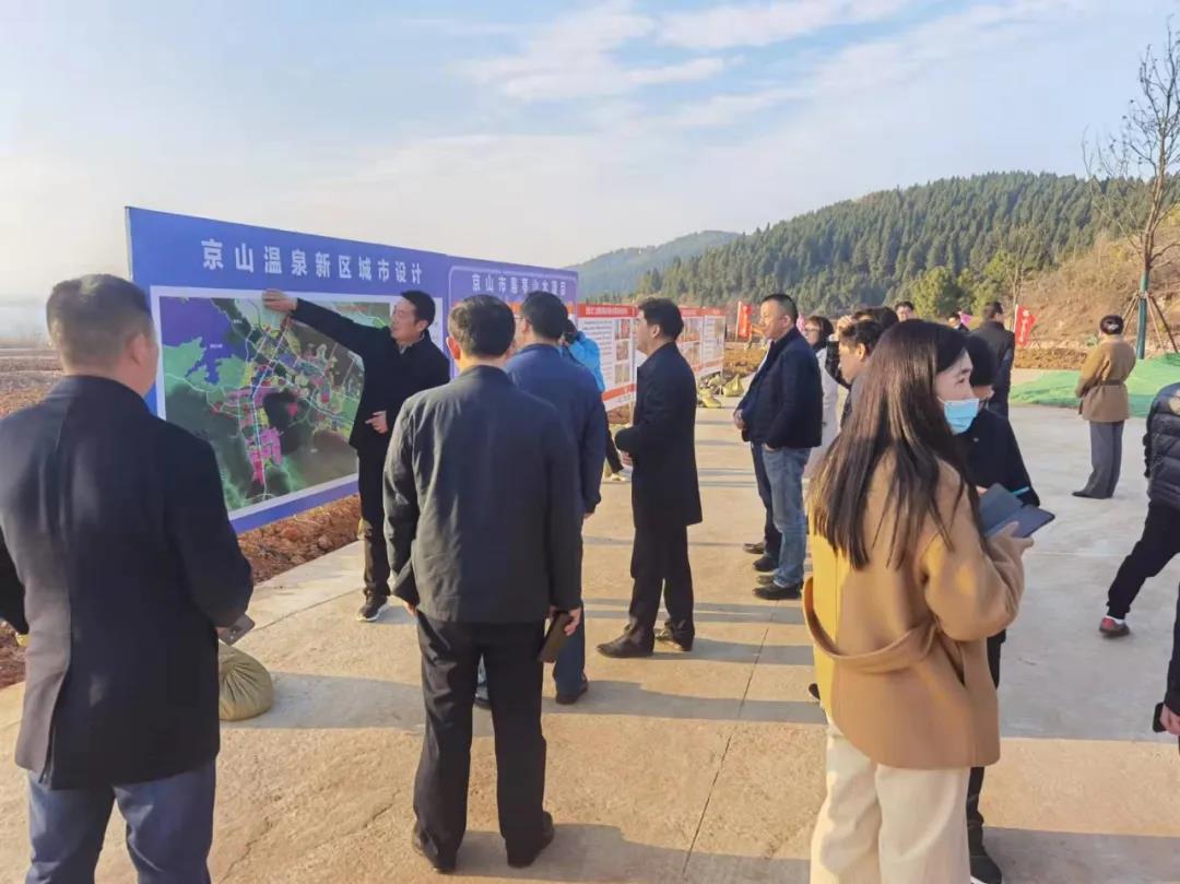 調研組先后考察了京山市惠亭山水花溪濕地工業項目區和濱河路項目區。京山市溫泉新區管委會書記陳愛龍,湖北工建總工程師、基礎設施公司黨委書記、董事長肖仲華現場向調研團隊介紹項目情況。